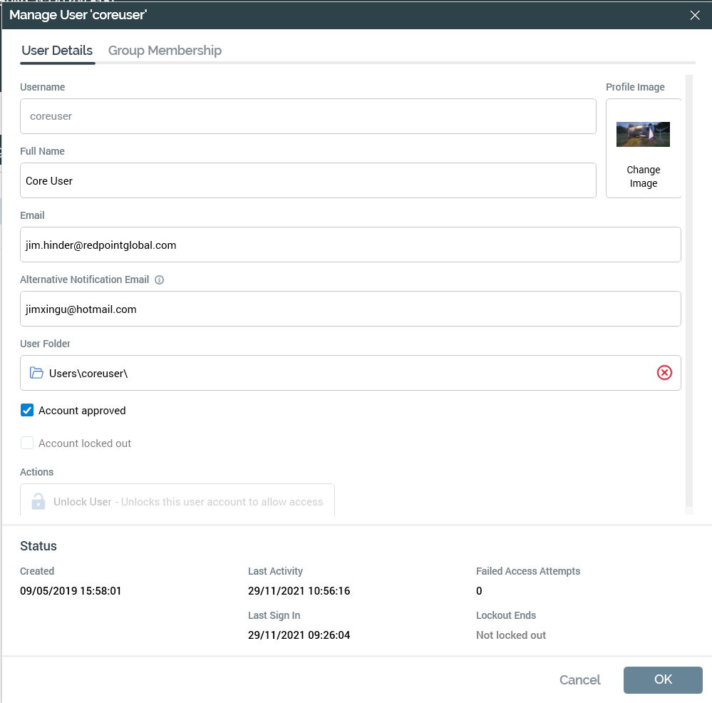 User Folder: as created alongside the user. The full file system path is shown. If desired, you can overwrite the default folder by browsing for another via the Choose Folder dialog; if you do so, only folders to which you have access are shown. If you select a folder to which the user being managed does not have access, a warning message is displayed. You can also clear the user folder. User folder is mandatory.