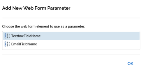 When you drag a web form from the toolbox and drop it onto email offer content, the Add New Web Form Parameter dialog is displayed: