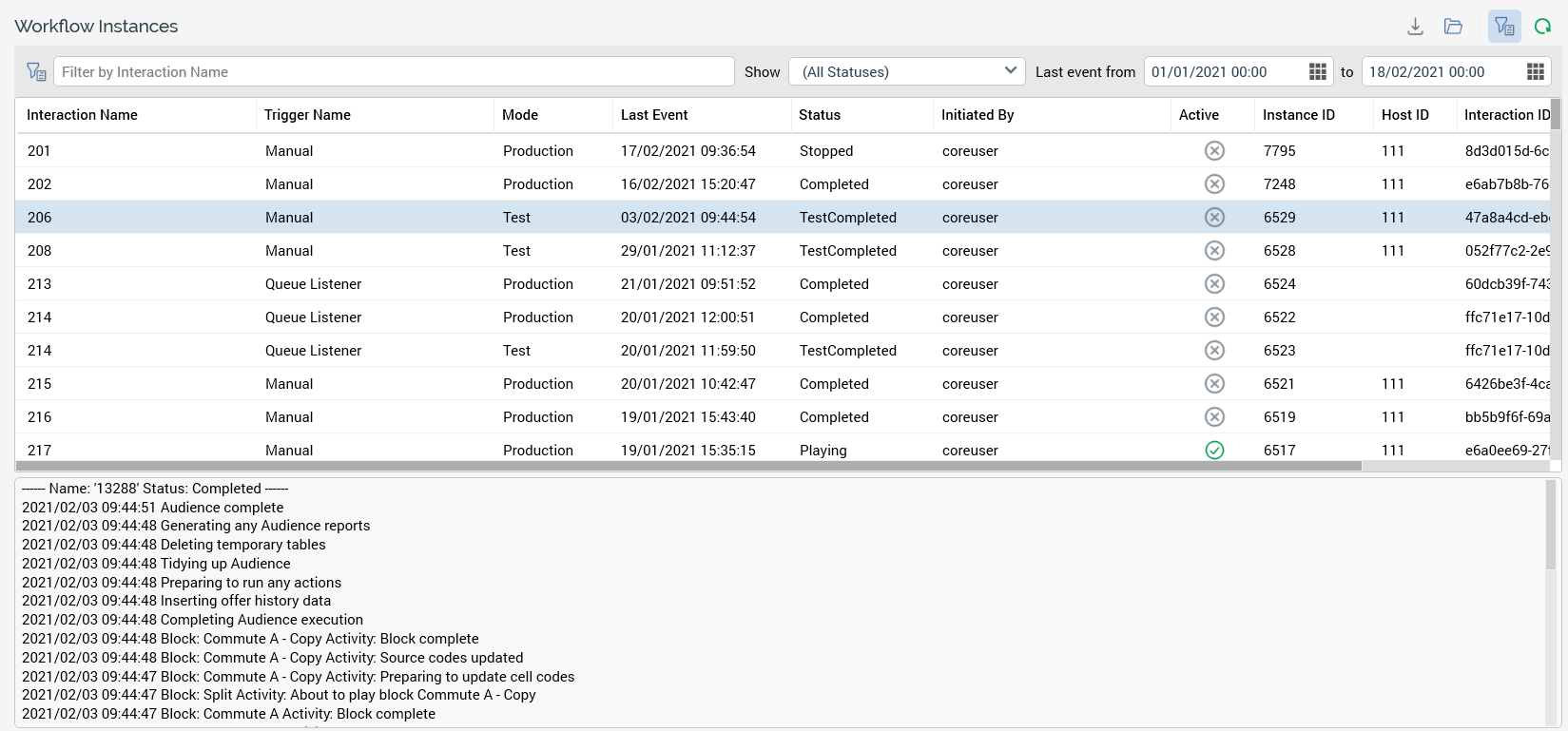 Filter by Interaction Name: you can limit the list of workflow instances to just those hosted within interactions with names matching a filter value entered here.